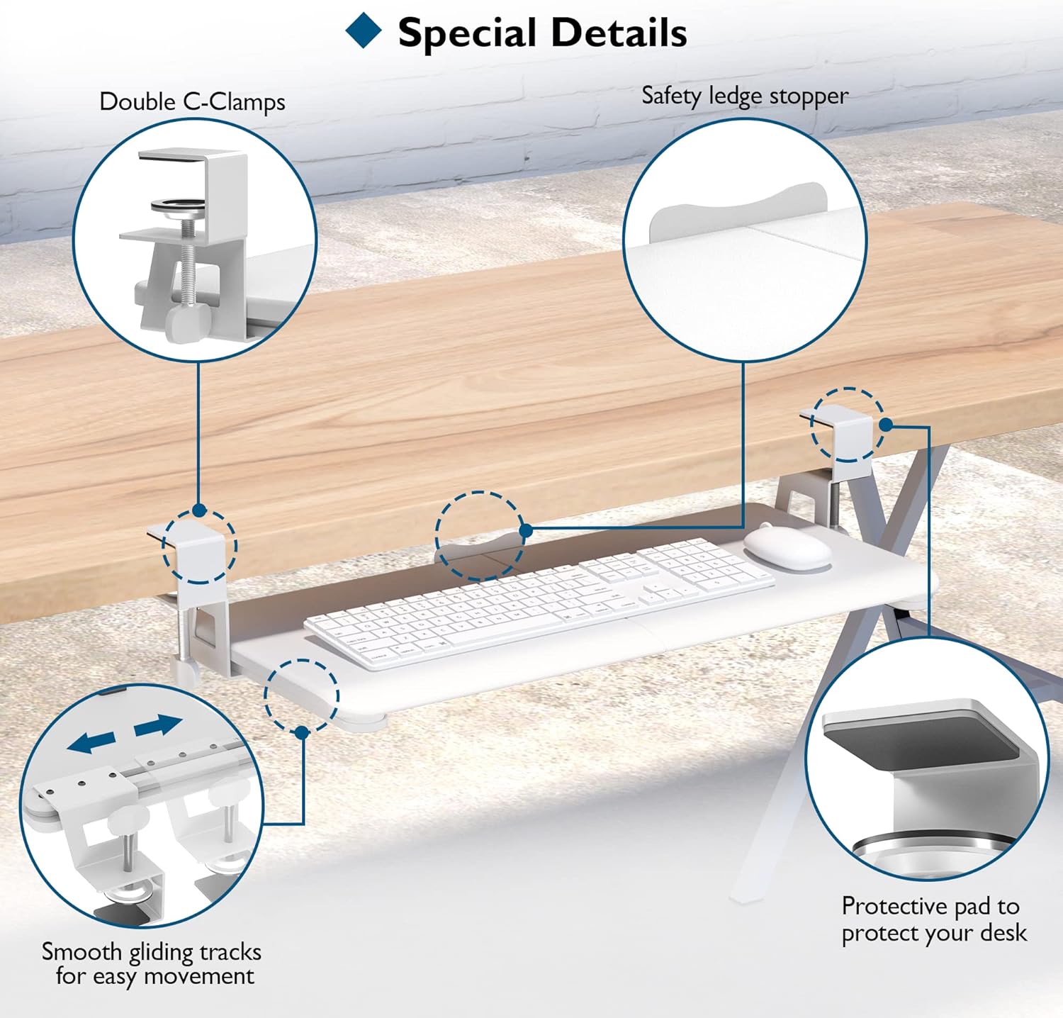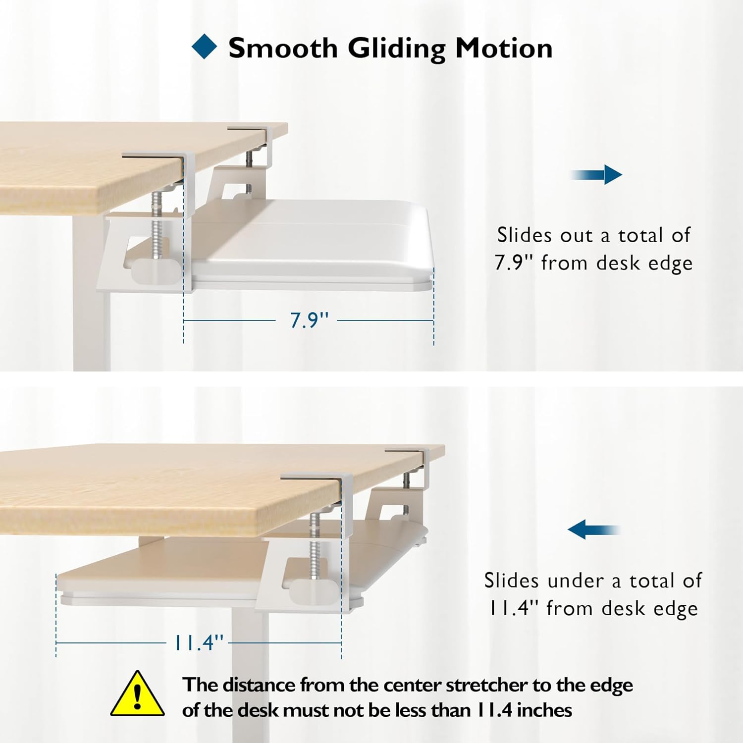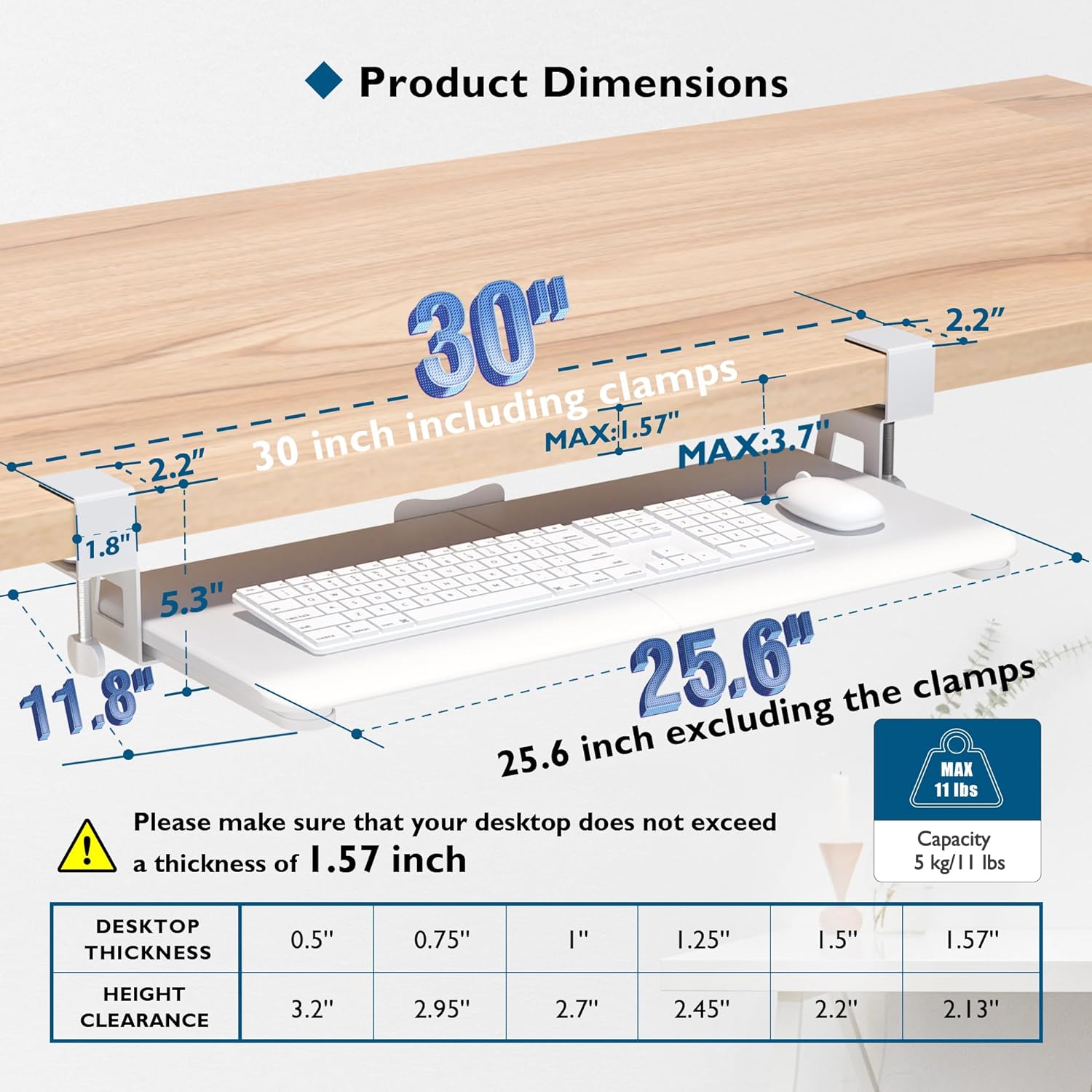 The pull-out design allows for easy access to your keyboard and mouse when needed, while the steady slide-out feature ensures smooth and stable movement. Measuring 25.6 inches in width (30 inches including clamps) and 11.8 inches in depth, this spacious tray provides ample room for comfortable typing and mouse navigation.